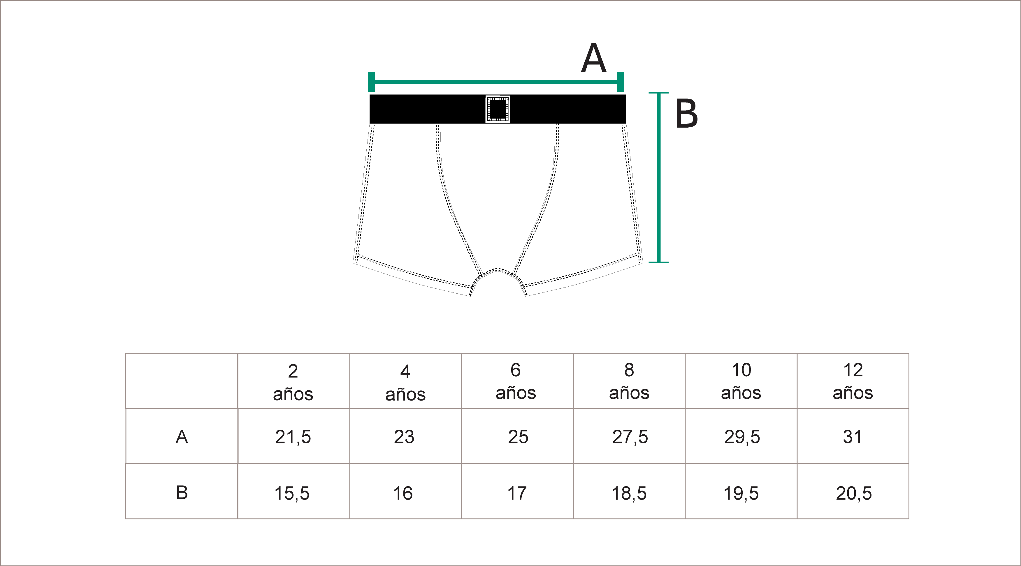 Recomendamos comparar estas medidas con una prenda similar que le quede bien al niño para una compra segura.